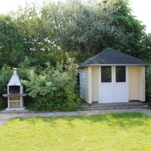 In de tuin is een barbecue aanwezig.