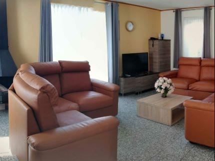 De woonkamer heeft een open haard, smart tv, en twee lederen hoekzitbanken met zitplaatsen voor 8 personen.